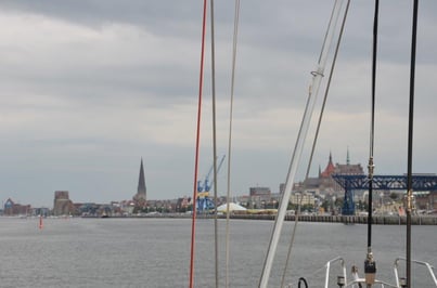 Nach einem 92 sm Toern, vorbei an den malerischen, 128 m hohen Kalkfelsen der daenischen Insel Moen, kommt am 25. August mit dem Sonnenuntergang die deutsche Ostseekueste in Sicht. Das erste, was wir von Warnemuende sehen, noch 20 sm entfernt, ist das Hotel Neptun. Unsere Naehte am Genua und am Grosssegel sind dabei, sich aufzuloesen – hoechste Zeit, nach Hause zu kommen!